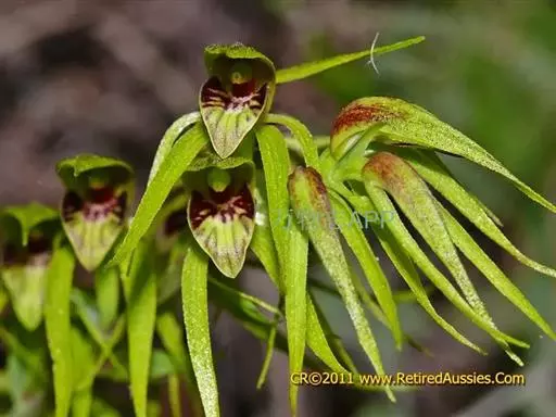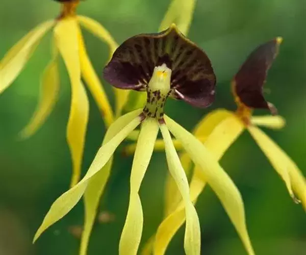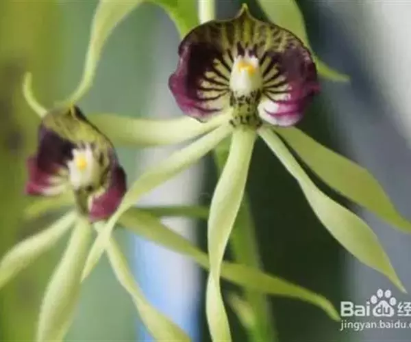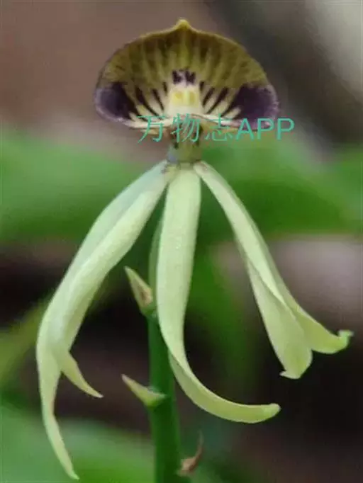多年生附生兰。株高15-30厘米,假鳞茎扁椭圆形,总状花序,自假鳞茎叶片着生处抽出,直立,花茎长25-30厘米,散生花10-15朵,由下向上逐次开放,花径5-7厘米,有香气,唇瓣长在正上方,略内弯,前部黄绿色带紫褐色粗条纹,两侧深紫色,基部白色,褶片黄色;蕊柱黄绿色带紫色斑块,与唇瓣不全部合生;花瓣和粤片黄绿色,无斑,线形,近等,均反折至唇瓣下方,自然下垂,稍有扭曲。花期夏秋季,单花花期可达25-30天。