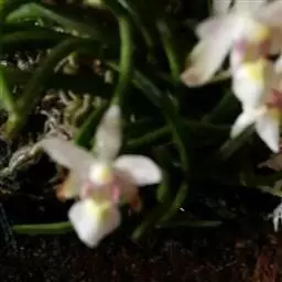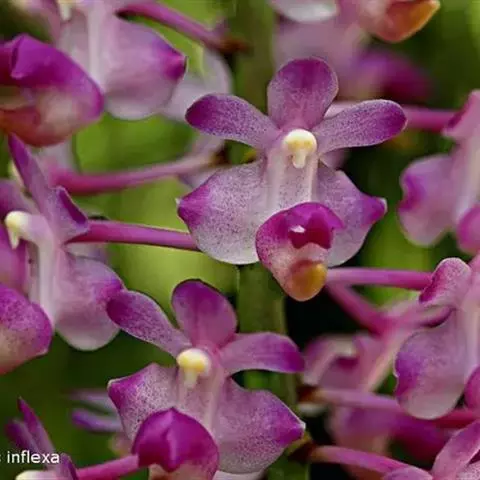 风兰 H.H.Hu):植株高8-10厘米。茎长1-4厘米,稍扁,被叶鞘所包。叶厚革质,狭长圆状镰刀形。…