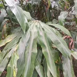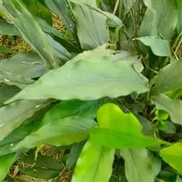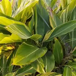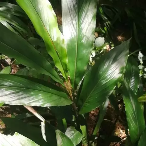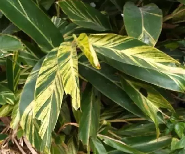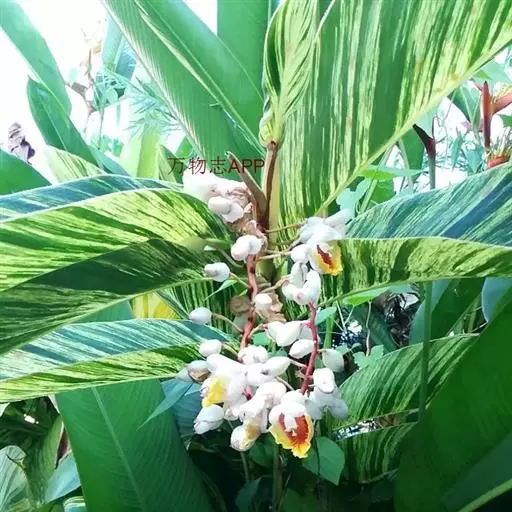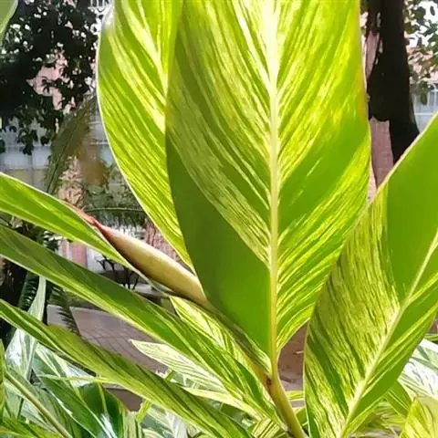 花叶良姜植株高可达1~2m,盆栽高度多在1米以下,具 根茎。革质叶片具鞘,长椭圆形,两端渐尖,叶长约50~60cm,宽约15~20cm,叶面深绿色,有金黄色富有光泽的纵斑纹,十分艳丽。