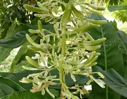 夏季6~7月开花,圆锥形花序,花序下垂,花蕾包藏于总苞片中,花白色,边缘黄色,顶端红色,唇瓣广展,花萼近钟形,花冠白色,花期夏季。
