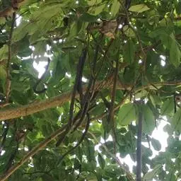 栗豆树属于中乔木,为奇数羽状复叶、小叶互生,叶形为披针状长椭圆形,长约8~12公分,全缘、革质。荚果长达20公分,种子(也就是绿元宝)为椭圆形,大如鸡蛋,可供烤食。