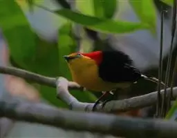 黄喉噪鹛体型略小,顶冠蓝灰色,特征为具黑色的眼罩和鲜黄色的喉。上体褐色,尾端黑色而具白色边缘,…