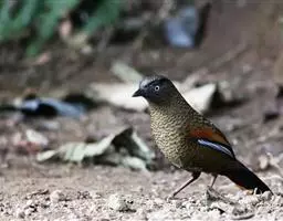 玉山噪鹛中等体型的褐色鸟类。白色长眉纹及髭纹显著;顶冠灰而具白色的鳞状斑纹;脸侧及颏褐色,…