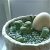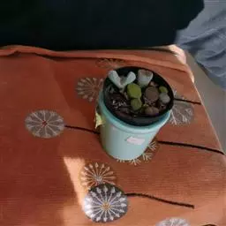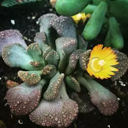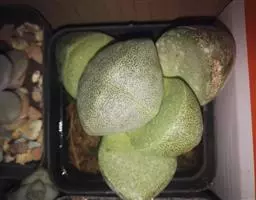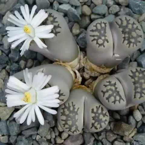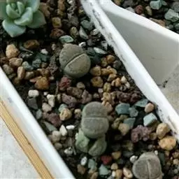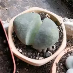 荒玉为番杏科生石花属,原产南非。株体呈白粉色,表面布满凹凸纹路,凹陷处为红褐色,每年秋季开黄花。