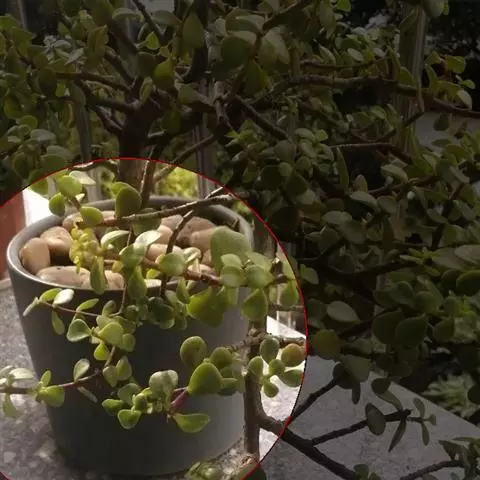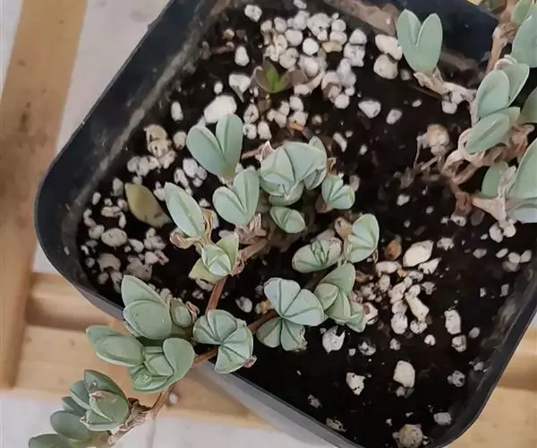 木质茎直立或匍匐,幼茎紫红色,株高可达20厘米;叶交互对生,对 生叶的基部相连并围绕茎,叶片肥厚肉质,略被白粉,叶缘和叶子背部有半透明纹路,叶尖和叶缘在阳光充足的环境中会泛稍紫红色,植株形态和鹿角海棠很相似。小花粉红色或紫红色,盛开在冬末至初春。