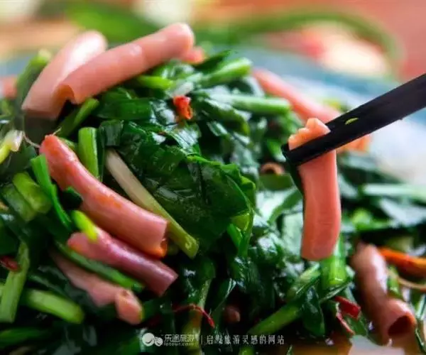 要材料,烹饪以拌菜为主。特色:海肠清脆鲜红,韭菜脆嫩鲜绿,红绿相间,顺色顺味。