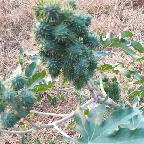 适时采收:蓖麻开花后50天左右,含油率达到最高,果穗上有80%的蒴果变成黄褐色,果实凹入部分有明显裂痕,用手可以捏开,是蓖麻成熟的标志,采收的标准是成熟一批,采收一批,初霜后一次收完。将成熟的果穗整体剪下,分批晾晒促进后熟。严防籽粒霉变,晾干脱粒后入库,并保持库房通风,干燥、低温。