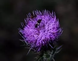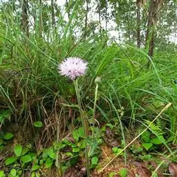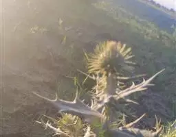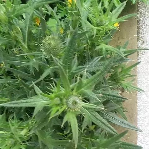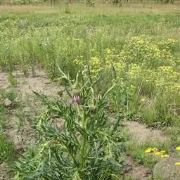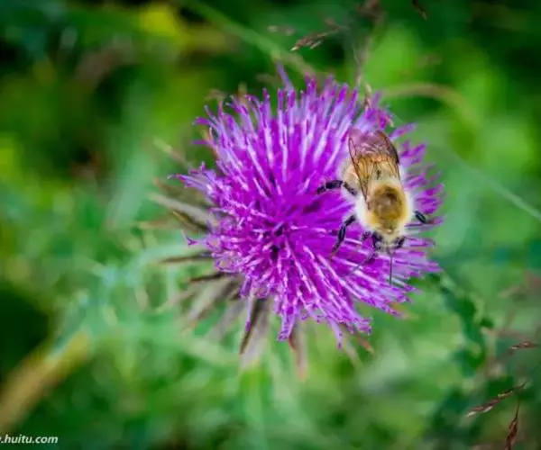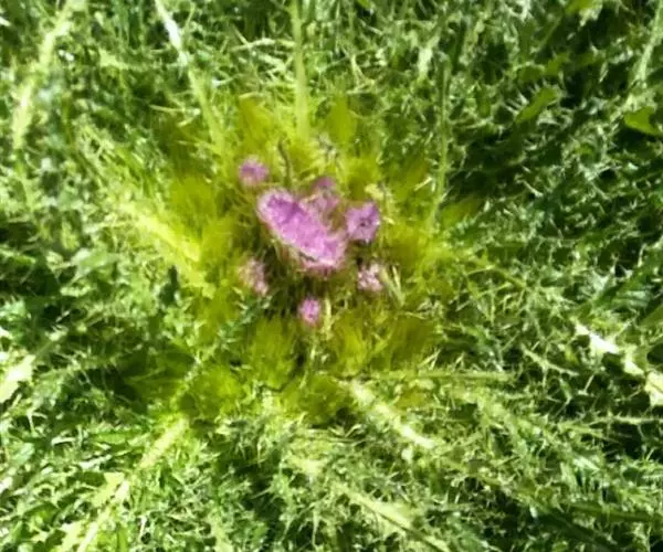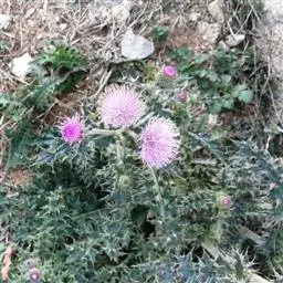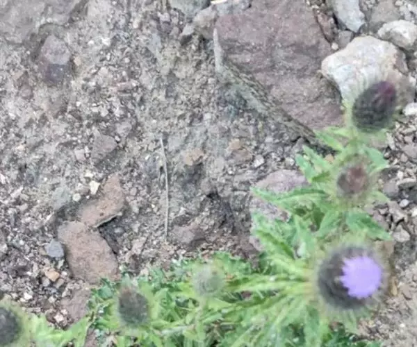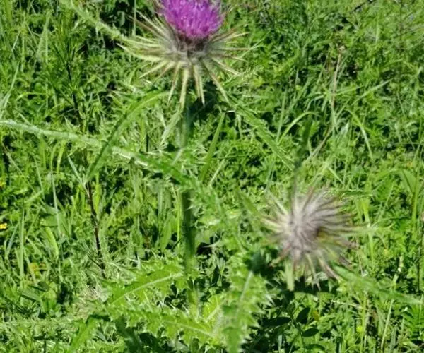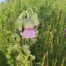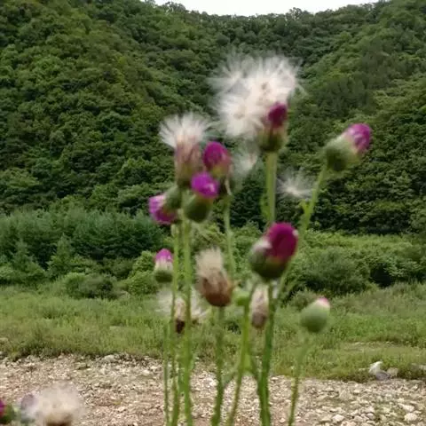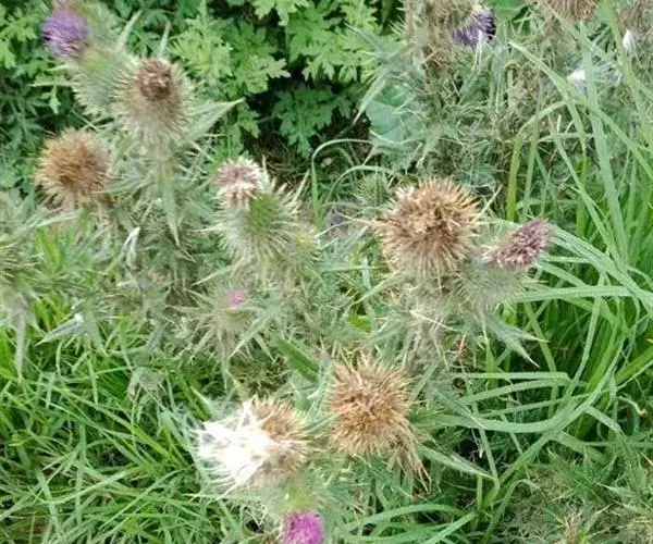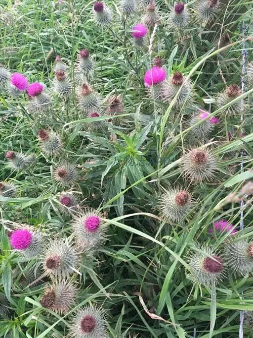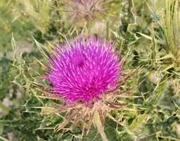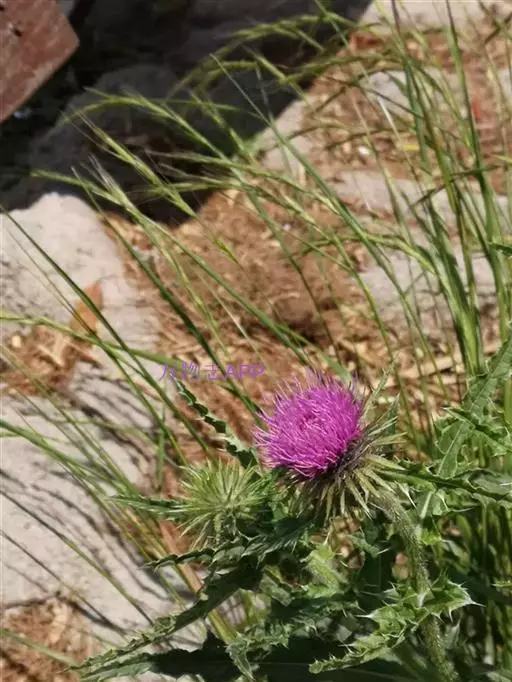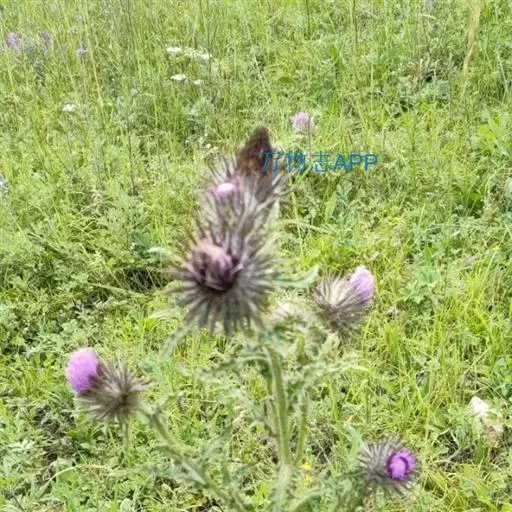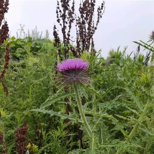 魁蓟,菊科, 蓟属;头状花序单生枝端,直立,总苞宽钟状,有蛛丝状毛。总苞片线装披针形,边缘有小刺,顶端成长尖刺。花冠紫色,长2. 5厘米,管状花的下部狭管部与具裂片的檐部近等长。花期7-9月。