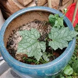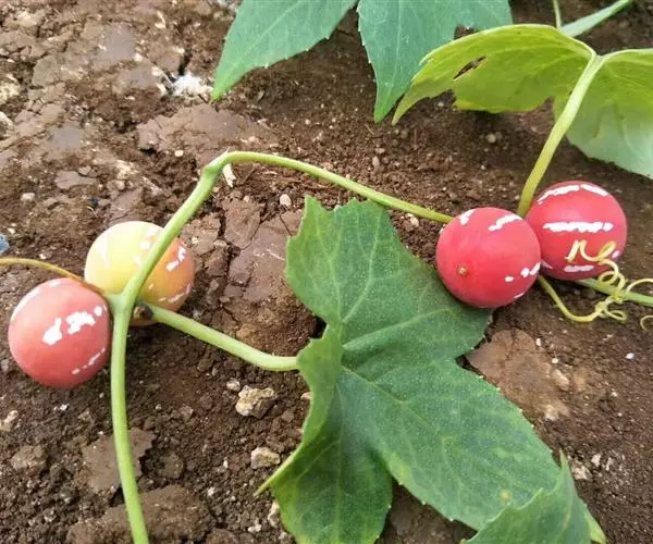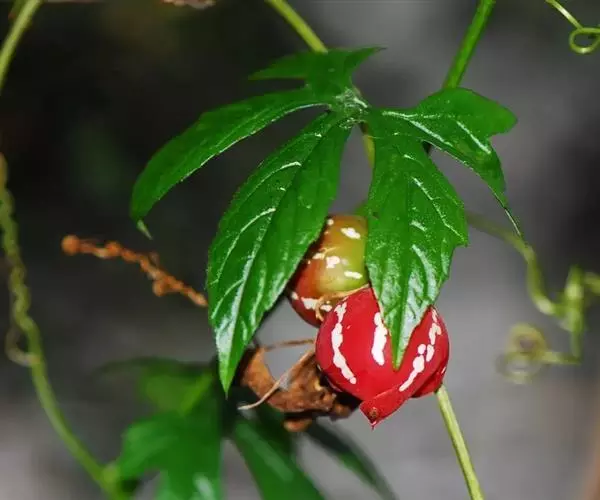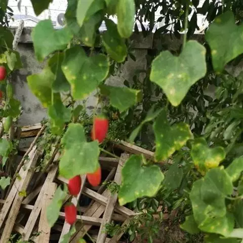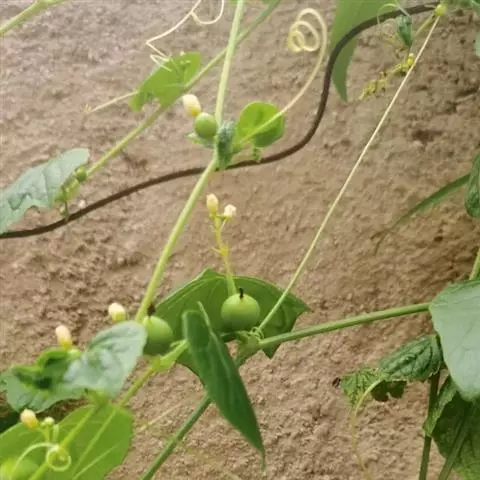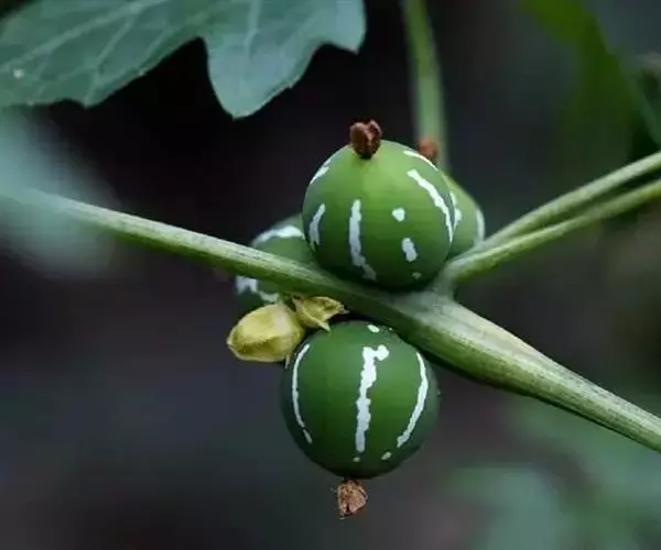 毒瓜 攀援草本;根块状;茎纤细,疏散,有明显的棱沟,光滑无毛。卷须纤细,2歧,无毛。叶柄粗糙,有棱沟,长4-6厘米,被疏散的柔毛;叶片膜质,轮廓宽卵圆形,长、宽均为8-12厘米,掌状5深裂,中间的裂片较长,长圆状披针形,长8-10厘米,宽2-3.5厘米,先端渐尖或钝圆,边缘有疏齿或呈波状,侧面的裂片较短,披针形或长圆状披针形,边缘有齿,基部的2裂片有时具不规则2-3浅裂,叶片基部的弯缺圆形或方形,深0.5-1.5厘米,宽2-2.5厘米,两面粗糙,上面深绿色,背面苍绿色,除脉上明显被柔毛外,近无毛。雌雄同株,雌、雄花常各数朵簇生在同一叶脉。雄花:花梗细,长0.5-1.5厘米,无毛,花萼筒短,长约2毫米,宽5-6毫米,裂片开展,钻形,长约0.5-1毫米;花冠绿黄色,径约7毫米,裂片卵形,长2毫米,宽约0.5-1毫米,先端稍钝,具明显3条脉,两面具小疣点;雄蕊3,1枚1室,2枚2室,花丝离生,极短,长1-1.5毫米,花药卵形,长2毫米,药室折曲。雌花:花萼和花冠与雄花相同;子房卵球形,平滑,近无毛,花柱细,上部3裂,柱头膨大,2裂。果实近无柄,球形,不开裂,直径14-18毫米,果皮平滑,黄绿色至红色,并间以白色纵条纹。种子少数,卵形,褐色,两面凸起,凸起部份厚达1-2毫米,环以隆起的环带,长5毫米,宽3毫米,厚3.5-4毫米。花期3-8月,果期7-12月。 [1-2]