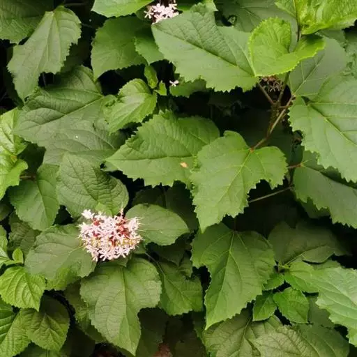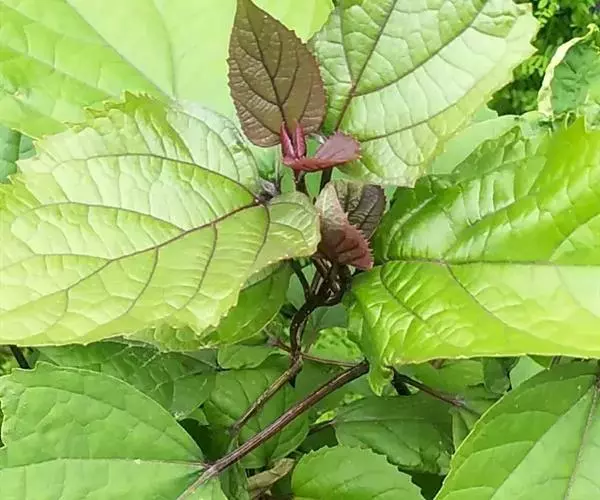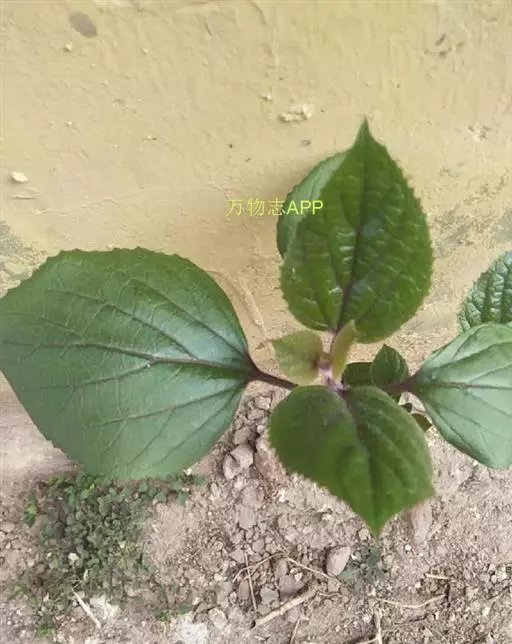 灌木,高1-2米,植株有臭味;花序轴、叶柄密被褐色、黄褐色或紫色脱落性的柔毛;小枝近圆形,皮孔显著。叶对生,叶片纸质,宽卵形或卵形,长8-20厘米,宽5-15厘米,顶端尖或渐尖,基部宽楔形、截形或心形,边缘具粗或细锯齿,侧脉4-6对,表面散生短柔毛,背面疏生短柔毛和散生腺点或无毛,基部脉腋有数个盘状腺体;叶柄长4-17厘米。