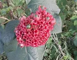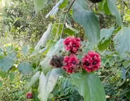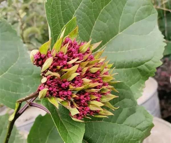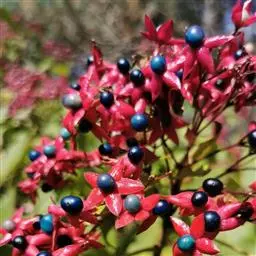 房状聚伞花序顶生,密集;苞片叶状,披针形或卵状披针形,长约3厘米,早落或花时不落,早落后在花序梗上残留凸起的痕迹,小苞片披针形,长约1.8厘米;花萼钟状,长2-6毫米,被短柔毛及少数盘状腺体,萼齿三角形或狭三角形,长1-3毫米;花冠淡红色、红色或紫红色,花冠管长2-3厘米,裂片倒卵形,长5-8毫米;雄蕊及花柱均突出花冠外;花柱短于、等于或稍长于雄蕊;柱头2裂,子房4室。核果近球形,径0.6-1.2厘米,成熟时蓝黑色。花果期5-11月。