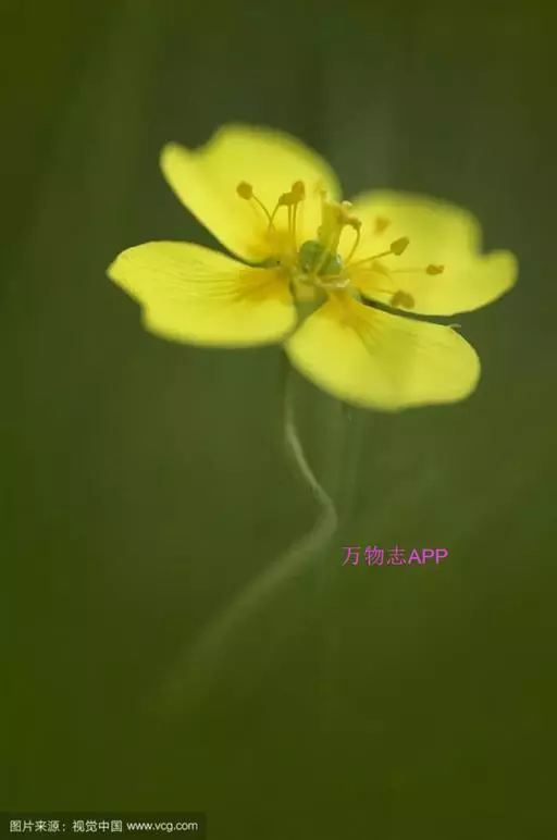 单花自叶腋生或与叶对生,花梗长6-9厘米,被疏柔毛;花直径1.5-2.2厘米;萼片卵状披针形,顶端急尖,副萼片长椭圆形或椭圆披针形,顶端急尖或圆钝,与萼片近等长,外面被疏柔毛,果时显著增大;花瓣黄色,宽倒卵形,顶端显著下凹,比萼片稍长;花柱近顶生,基部细,柱头扩大。瘦果黄褐色,卵球形,外面被显著点纹。花果期4-9月。