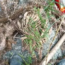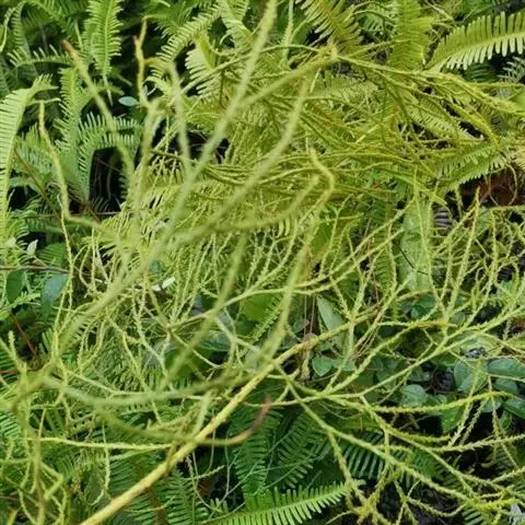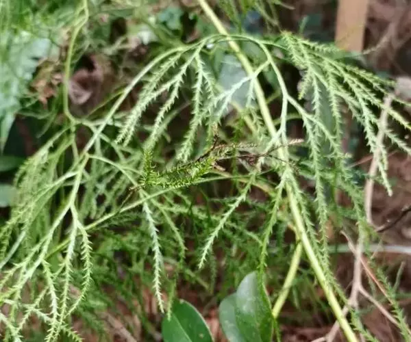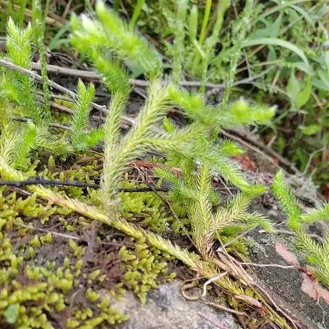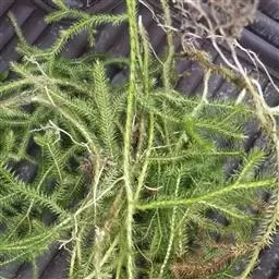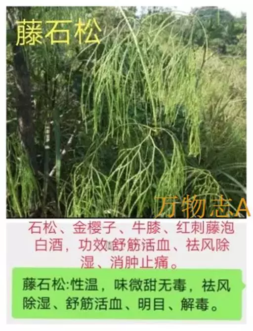藤石松,为石松科石子藤石松,多年生攀援草本植物,长可达4m。主茎下部有叶疏生,叶钻状披针形,先端长渐尖,膜质,灰白色,向上的叶较小,绿色,厚革质,有早落的膜质尖尾。植物的全草可供药用,《四川中药志》:能舒筋活血。治风湿关节痛,跌打损伤,筋骨疼痛,月经不调及脚转筋。