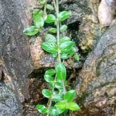 多年生匍匐草本。植株干后黄绿色。茎被金黄色柔毛。叶片薄纸质或纸质,椭圆形、卵状椭圆形或卵形,长1-2.4(-2.8)厘米,宽0.6-0.5厘米,先端急尖,基部圆形,干后边缘略反卷,具缘毛。