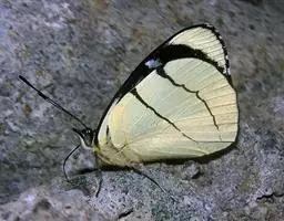 翅面乳白色,前翅面亚外缘有2列黄白斑,中室端外有2个斑;后翅亚外缘有2列黑斑,臀角淡黄色,内侧有2个黑斑。翅反面中横带外侧有新月形黑斑列,基横带两侧黑边粗,前翅中室内和端脉外各有2个黑点。