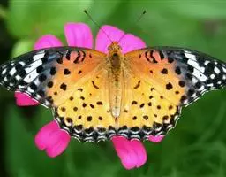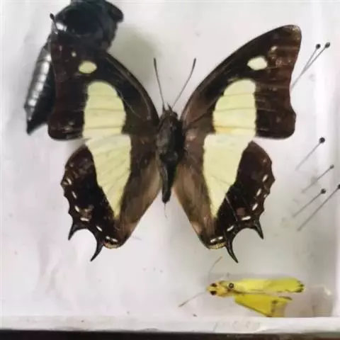 该种雄蝶翅展82mm,雌蝶翅展80mm。外缘有2列黄白色斑,中室端外有2个亚外缘有2列黑斑。翅反面亚外缘横带新月形黑斑列,中横带两侧黑边较粗,横带不分叉,中室内和端脉外各有2个黑点。九连山采集地:大丘田、横坑水、墩头。