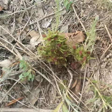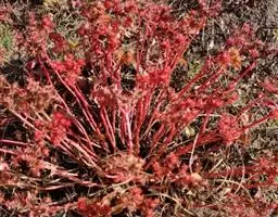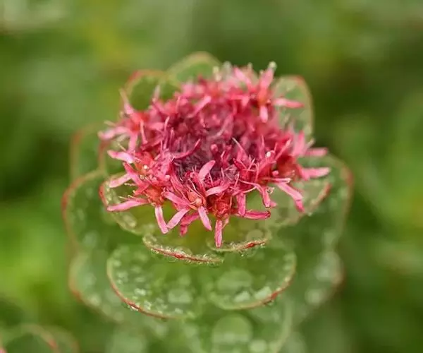 多年生草本。地上的根颈短,残存花枝茎少数,黑色,高5-20厘米。不育枝直立,高5-17厘米,先端密着叶,叶宽倒卵形,长1-3厘米。花茎多,直立或扇状排列,高5-20厘米,稻杆色至红色。叶有短的假柄,椭圆状长圆形至几为圆形,长1.2-3厘米,宽1-2.2厘米,先端钝或有短尖,全缘或波状或有圆齿。花序伞房状,有多花,长2厘米,宽2-3厘米,有苞片;花大形,有长梗,雌雄异株;雄花萼片5,狭三角形至披针形,长2-2.5毫米,钝;花瓣5,红色,倒披针形,长6-7.5毫米,宽1-1.5毫米,有长爪,先端钝;雄蕊10,与花瓣同长,对瓣的着生基部上2.5毫米;鳞片5,近正方形至长方形,长1-1.2毫米,宽0.5-0.8毫米,先端有微缺;心皮5,披针形,长3-3.5毫米,不育;雌花蓇葖5,直立,长8-10毫米,花枝短,干后红色;种子倒卵形,长1.5-2毫米,两端有翅。花期6-7月,果期7-8月。