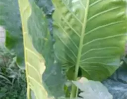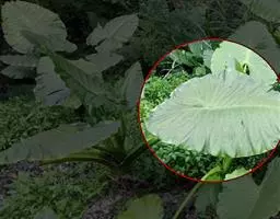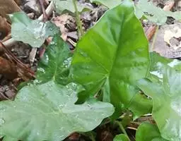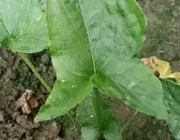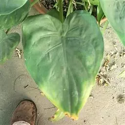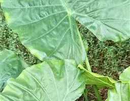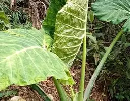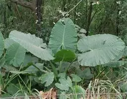 多年生草本。株高30厘米-40厘米,无茎或茎短小,具块茎或伸长的根茎,有时茎变厚而木质。叶基生,叶长椭圆状披针形,两端渐尖,叶脉明显,叶柄长,深绿色,基部呈鞘状,叶全缘或有分裂。