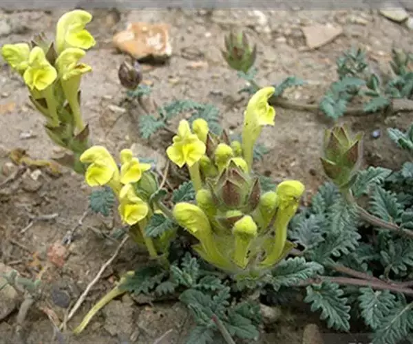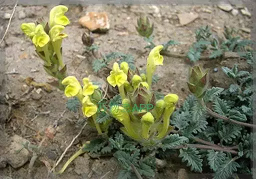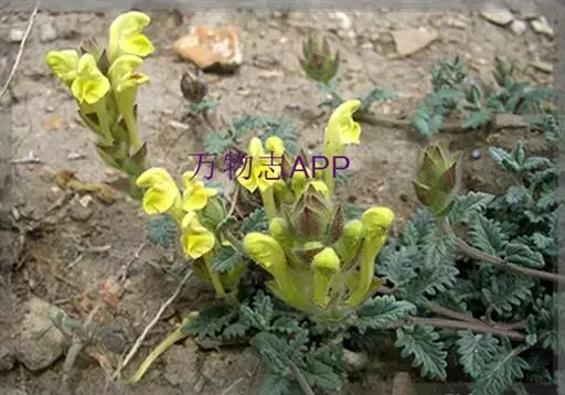 花萼开花时长2毫米,盾片高1.5毫米,均被长柔毛,杂有具柄腺毛,果时花萼长4毫米,盾片高约4毫米。花冠长约2.5-3.3厘米,黄色,或在上唇及下唇侧裂片处带紫,外被疏柔毛及具柄短腺毛;冠筒基部微囊大,宽约1.5毫米,中部以上渐宽,至喉部宽达7毫米;冠檐2唇形,上唇盔状,先端微缺,下唇中裂片宽卵圆形,先端微缺,2侧裂片短小,卵圆形。雄蕊4,前对较长,具能育半药,后对较短,具全药,药室裂口具白色髯毛;花丝丝状,扁平,近无毛。