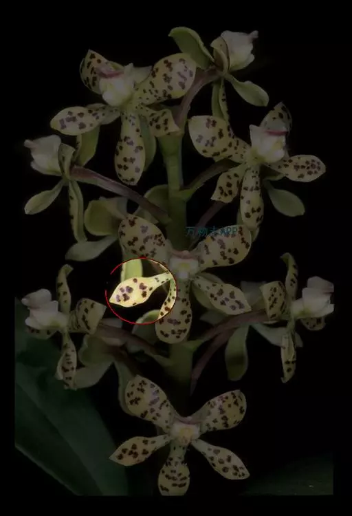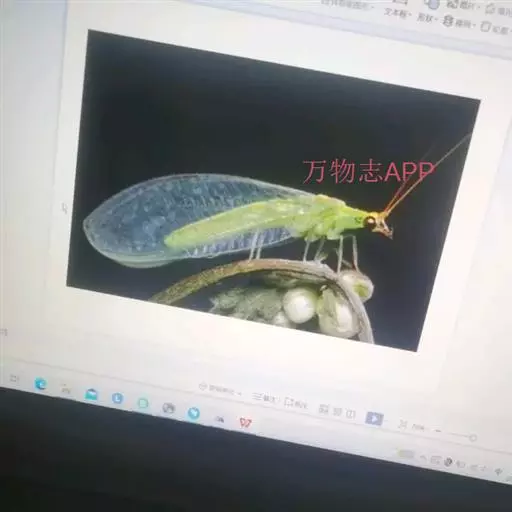 成虫体长(头突至腹末)37-42mm,翅展68-79Mm,体色艳丽。头额延伸如长鼻,额突背面红褐色,腹面黄色,散布许多白点。复眼大,暗褐色;单眼1对红色,位于复眼正下方。触角短,柄节圆柱形,梗节膨大如球,鞭节刚毛状,暗褐色,胸部红褐色,有零星小白点;前胸背板具中脊,中域有2个明显的凹斑。两侧前沿略呈黑色;中胸背板色较深,有3条纵脊。前翅绿色,外半部约有14个圆形黄斑,翅基部有1条黄赭色横带,近1/3至中部处有两条交叉的黄赭色横带,有时中断;这些圆斑和横带的边缘常围有白色蜡粉。后超橙黄色,顶角黑褐色。足黄褐色,但前、中足的胫、跗节黑褐色。腹部背面桔黄色,腹面黑褐色,被有蜡质白粉,各节后缘为黄色狭带,腹末肛管黑褐色。