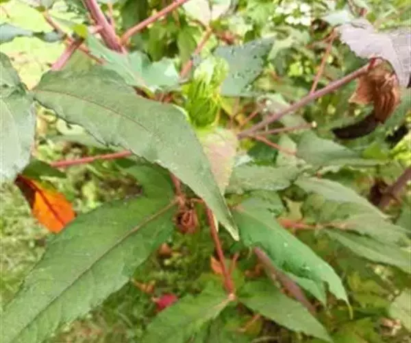 红秋葵为多年生直立草本,高1-3米,茎带白霜,无毛。叶指状5裂,裂片狭披针形,长6-14厘米,宽6-15毫米,先端锐尖,基部楔形,边缘具疏齿,两面均平滑无毛;叶柄长5-10厘米,平滑无毛。