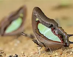 展翅宽45--90mm,平均在65--75mm.翅浓紫褐色,外缘有灰黄色宽边,内侧有7--8个蓝紫色的椭圆形纹排列成横列,前翅顶角附近有2个白色斜斑。翅反面黑褐色,有极密的黑色波状细纹,外缘黄白色。