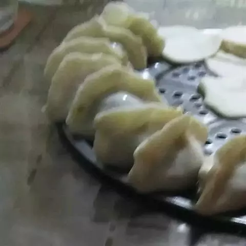 9. 倒入半碗清水,约至饺子的三分之一处。加盖,保持中大火。