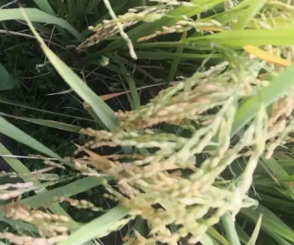 谷粒瘟:产生褐色椭圆形或不规则斑,可使稻谷变黑。有的颖壳无症状,护颖受害变褐,使种子带菌。
