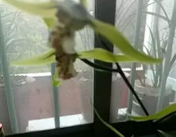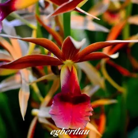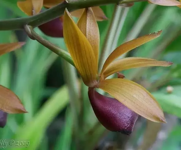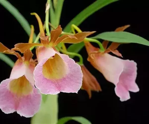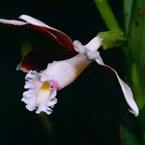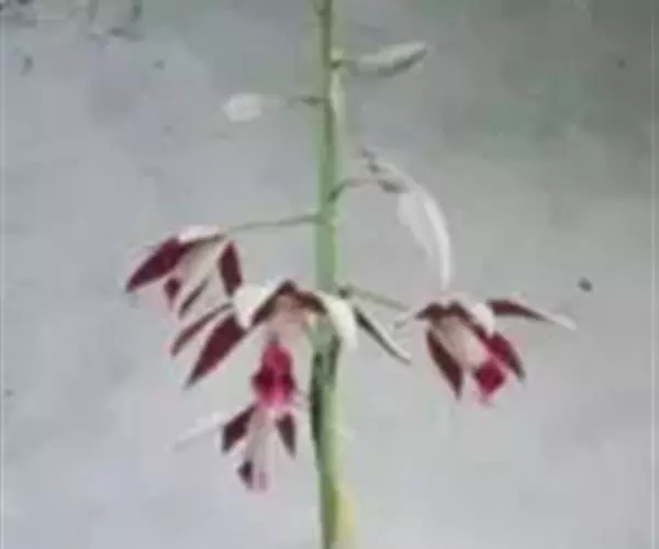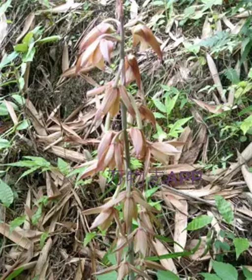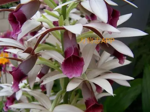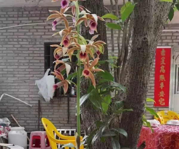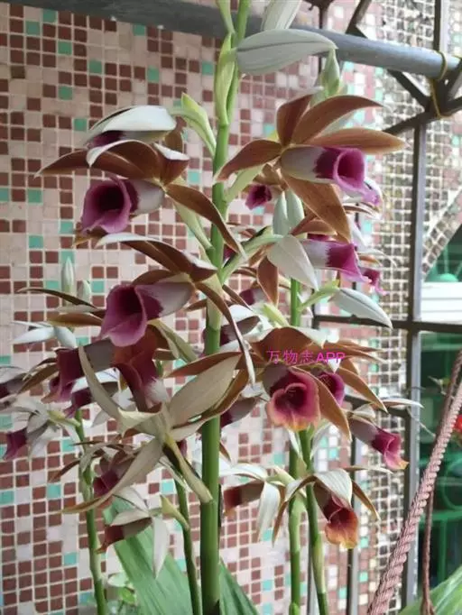 花葶从假鳞茎基部或叶腋发出,直立,圆柱形,长达1米,粗约1厘米,疏生数枚大型的鳞片状鞘,无毛;总状花序具多数花;花苞片大,膜质,通常早落,舟形,比花梗和子房长,先端急尖,无毛;花梗和子房长3-4厘米;子房稍扩大,无毛;花大,美丽,背面白色,内面暗赭色或棕色,直径7-10厘米;萼片近相似,长圆状披针形,长4-6厘米,宽约1厘米,先端短渐尖,具7条脉,无毛。