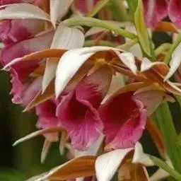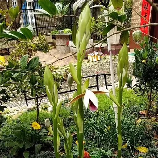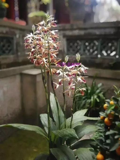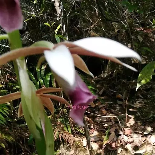 鹤顶兰(学名:Phaius tankervilleae (Banks ex L'Herit. ) Bl.):植物体高大。假鳞茎圆锥形,长约6厘米或更长。叶2-6枚,互生于假鳞茎的上部,长圆状披针形,两面无毛。花葶从假鳞茎基部或叶腋发出,直立,圆柱形,长达1米,粗约1厘米,疏生数枚大型的鳞片状鞘,无毛;总状花序具多数花;花大,美丽,背面白色,内面暗赭色或棕色,直径7-10厘米;花瓣长圆形,与萼片等长而稍狭,先端稍钝或锐尖,具7条脉,但近边缘的脉分枝,无毛;唇瓣贴生于蕊柱基部,背面白色带茄紫色的前端,内面茄紫色带白色条纹,摊平后整个轮廓为宽菱形或倒卵形,比萼片短,宽3-5厘米,中部以上浅3裂。花期3-6月。
