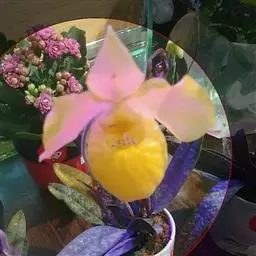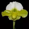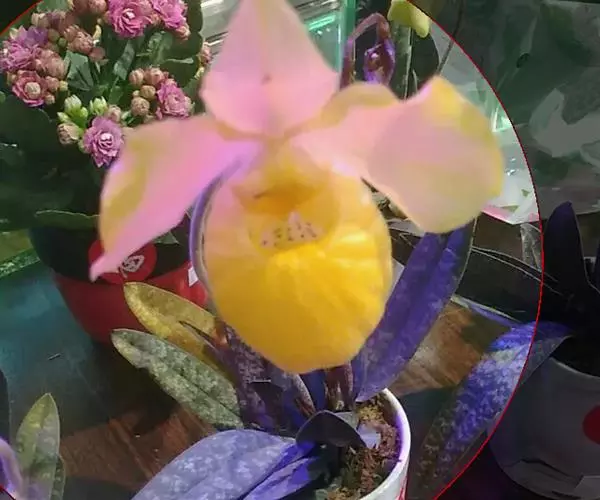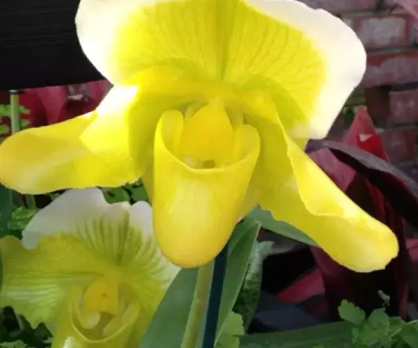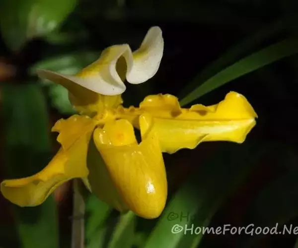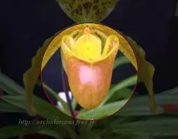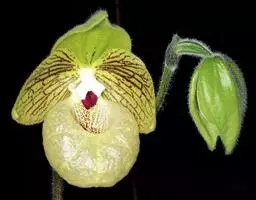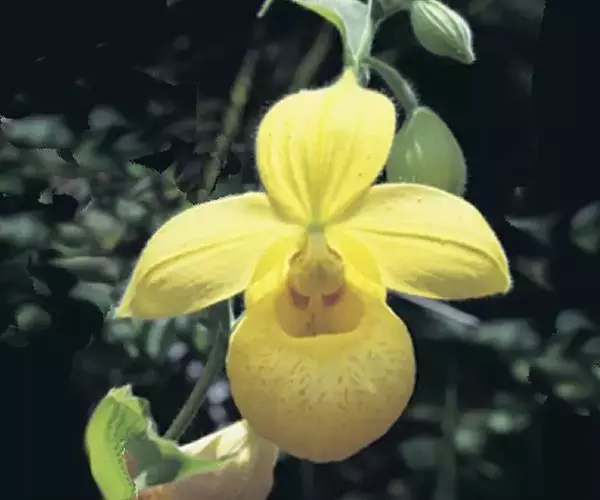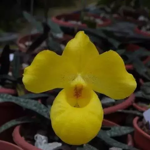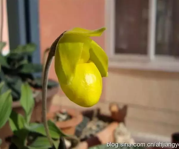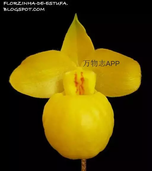 花葶直立,长15-28厘米,淡紫红色与绿色相间,被褐色短毛,顶端生1花;花苞片卵状披针形或卵形,长1.3-1.8厘米,淡绿黄色并有紫红色斑点,稍被毛;花梗和子房长3.5-4厘米,被白色短柔毛;子房有6条钝的纵棱;花大,直径7-9厘米,纯黄色,仅退化雄蕊上有浅栗色纵纹;中萼片卵形或卵状披针形,长2.2-4.8厘米,宽1.4-2.2厘米,先端近急尖,背面近顶端与基部具长柔毛,边缘具缘毛;合萼片与中萼片相似,长2-3.5厘米,宽1.2-2厘米,先端钝而不裂,背面具长柔毛并有2条钝的龙骨状突起,边缘具缘毛;花瓣大,宽卵状椭圆形、宽卵形或近圆形,长2.8-5.3厘米,宽2.5-4.8厘米,先端急尖或近浑圆,内表面基部具白色长柔毛,边缘具缘毛;唇瓣深囊状,近椭圆状球形或宽椭圆形,长4-5厘米,宽3.5-4厘米,基部具短爪,囊口近圆形,整个边缘内折,但先端边缘较狭窄,囊底有白色长柔毛和紫色斑点;退化雄蕊宽卵形或卵圆形,长1-2厘米,宽1-1.5厘米,先端急尖,背面具钝的龙骨状突起。花期2-4月。