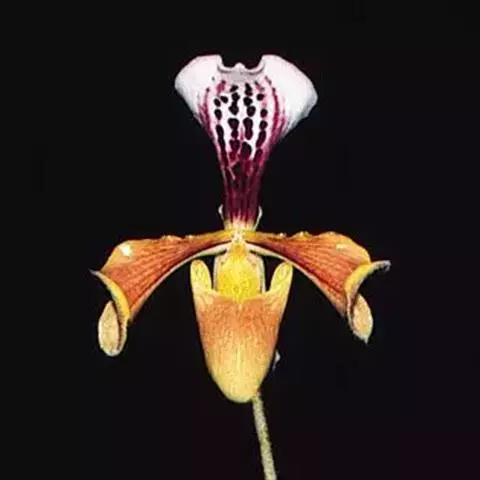 地生或半附生植物,地下具细长而横走的根状茎; 杏黄兜兰 - 墨线图 根状茎直径2-3毫米,有少数稍肉质而被毛的纤维根。叶基生,二列,5-7枚;叶片长圆形,坚革质,长6-12厘米,宽1.8-2.3厘米,先端急尖或有时具弯缺与细尖,上面有深浅绿色相间的网格斑,背面有密集的紫色斑点并具龙骨状突起,边缘有细齿,基部收狭成叶柄状并对折而套叠。