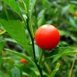 酸浆为茄科酸浆属多年生直立草本植物,株高50-80cm,地上茎常不分枝,有纵棱,茎节膨大,幼茎被有较密的柔毛。根状茎白色,横卧地下,多分枝,节部有不定根。叶互生,每节生有1-2片叶,叶有短柄,长1-3cm,叶片卵形,长6-9cm,宽5-7cm,先端渐尖,基部宽楔形,边缘有不整齐的粗锯齿或呈波状,无毛。花5基数,单生于叶腋内,每株5-10朵。花萼绿色,5浅裂,花后自膨大成卵囊状,基部稍内凹,长2.5-5cm,直径2.5-3.5cm,薄革质,成熟时橙红色或火红色;花冠辐射状,白色,雄蕊5,花药黄色,长0.3-0.35cm,子房上位,2心皮2室,柱头头状,长1.0-1.1cm。萼内浆果橙红色,直径1.5-2.5cm,单果重2.5-4.3g,每果内含种子210-320粒,种子肾形,淡黄色,长约0.2cm,千粒重1.12g。