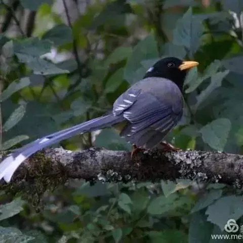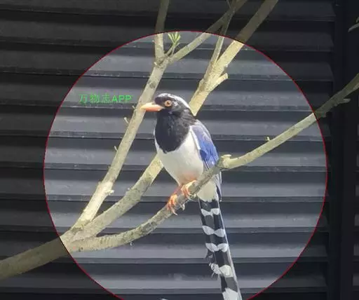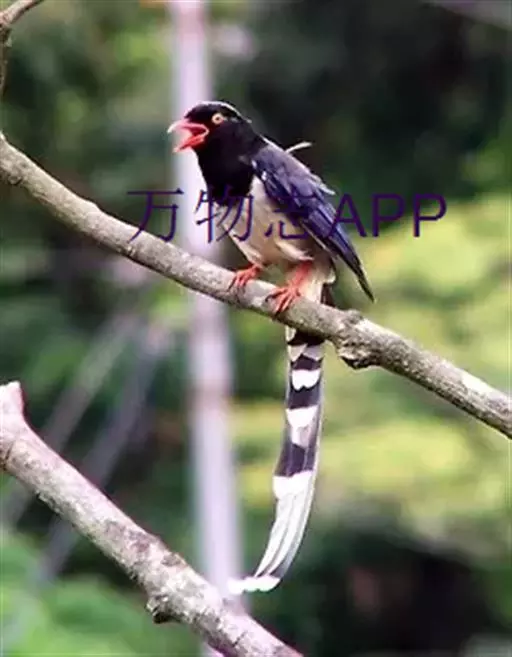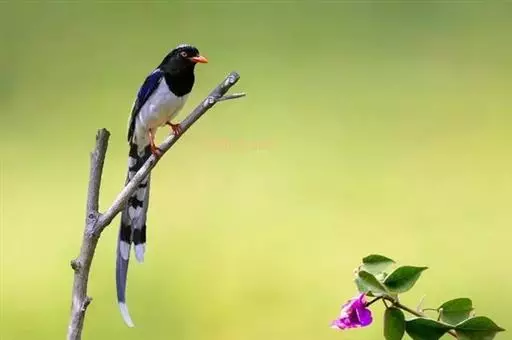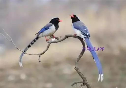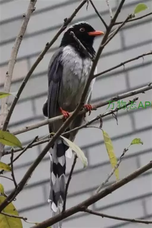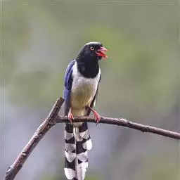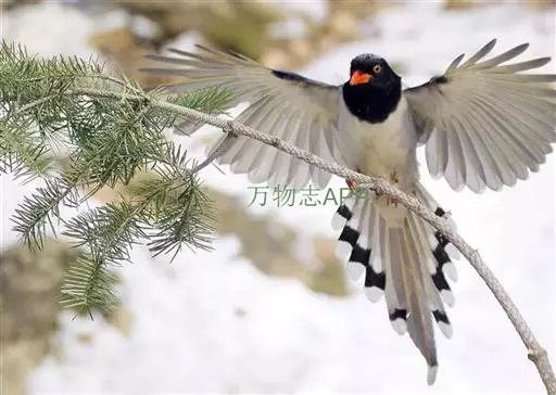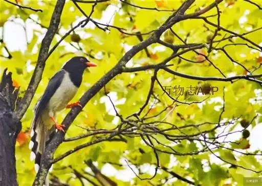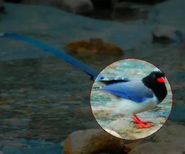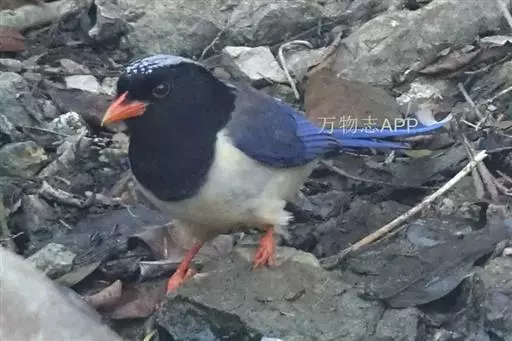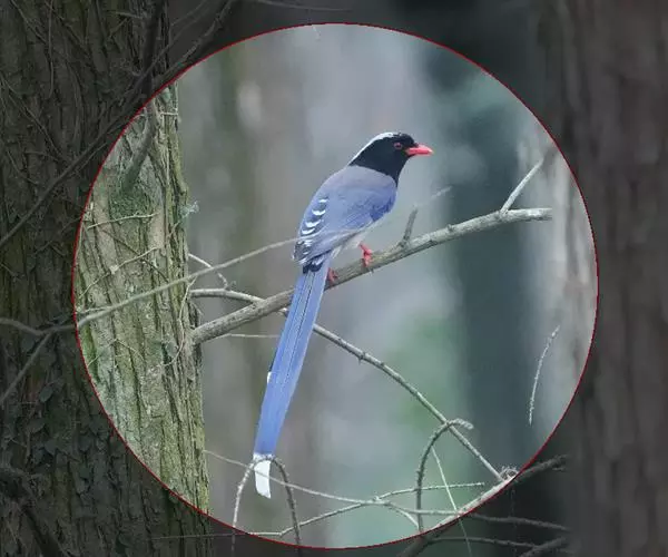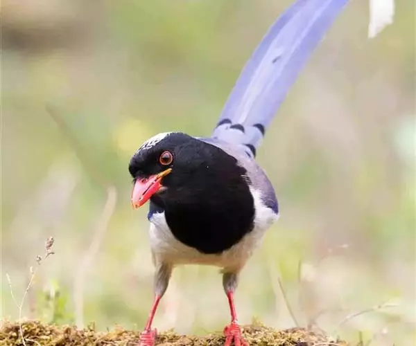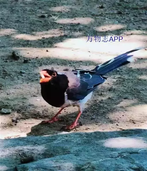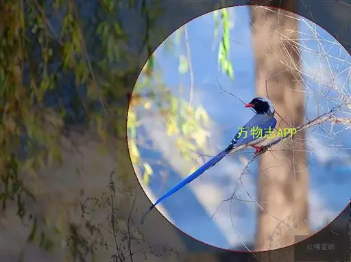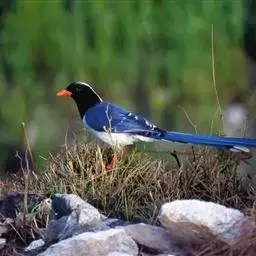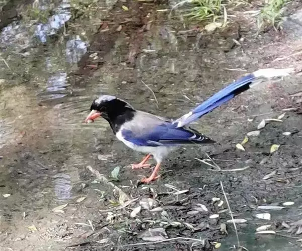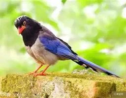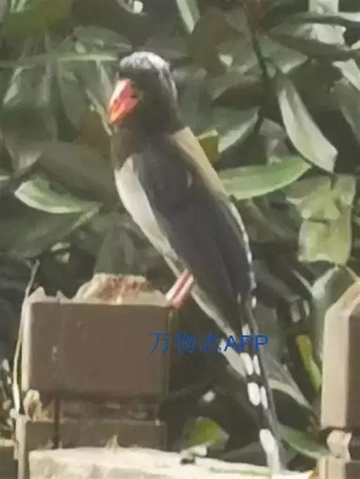 红嘴蓝鹊(学名:Urocissa erythrorhyncha) :是大型鸦类,体长54-65厘米。嘴、脚红色,头、颈、喉和胸黑色,头顶至后颈有一块白色至淡蓝白色或紫灰色块斑,其余上体紫蓝灰色或淡蓝灰褐色。尾长呈凸状具黑色亚端斑和白色端斑。下体白色。 黄嘴蓝鹊外形和羽色和该种非常相似,但黄嘴蓝鹊嘴为黄色,头部仅枕有白色块斑。区别仍很明显,野外不难识别。