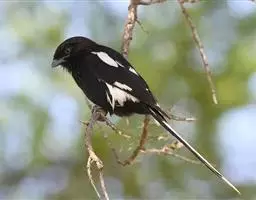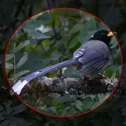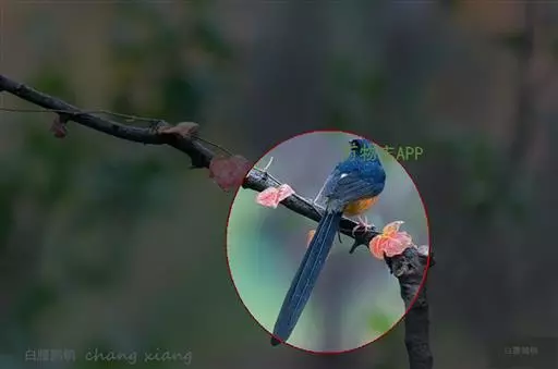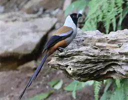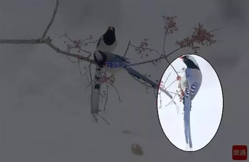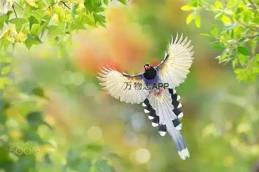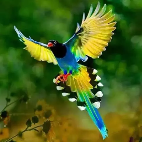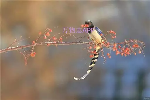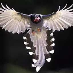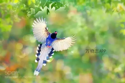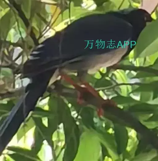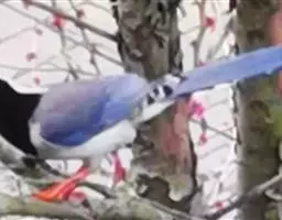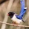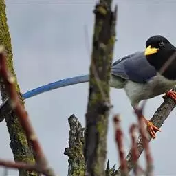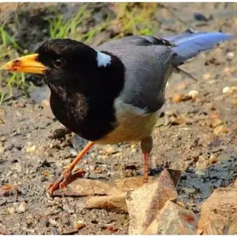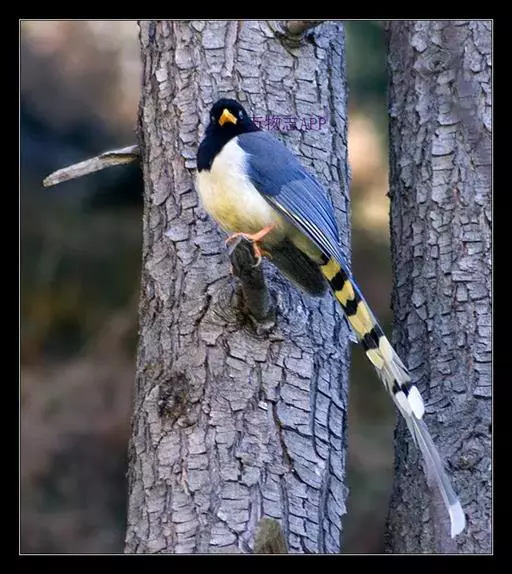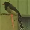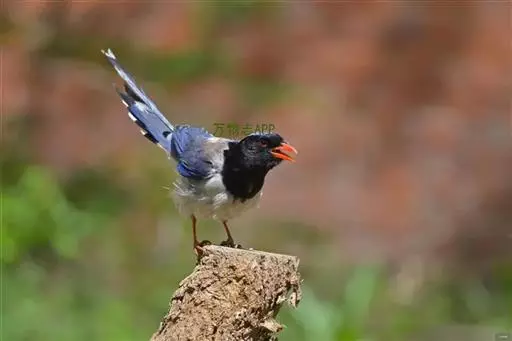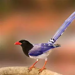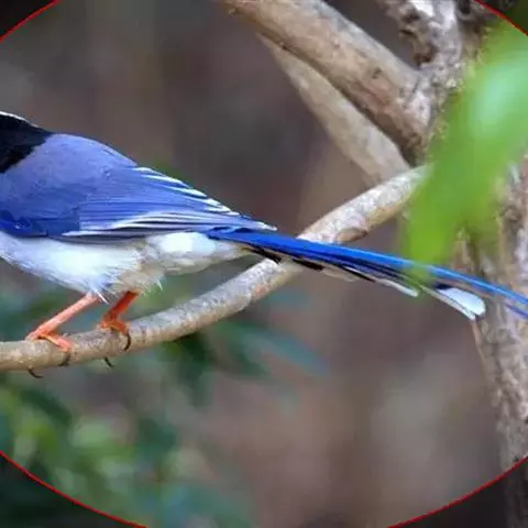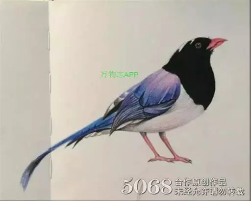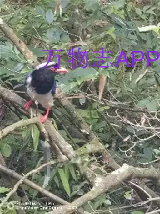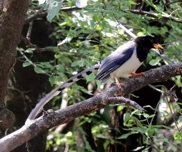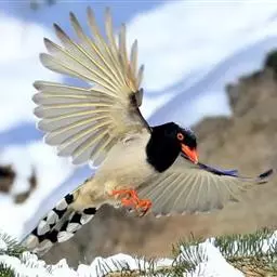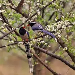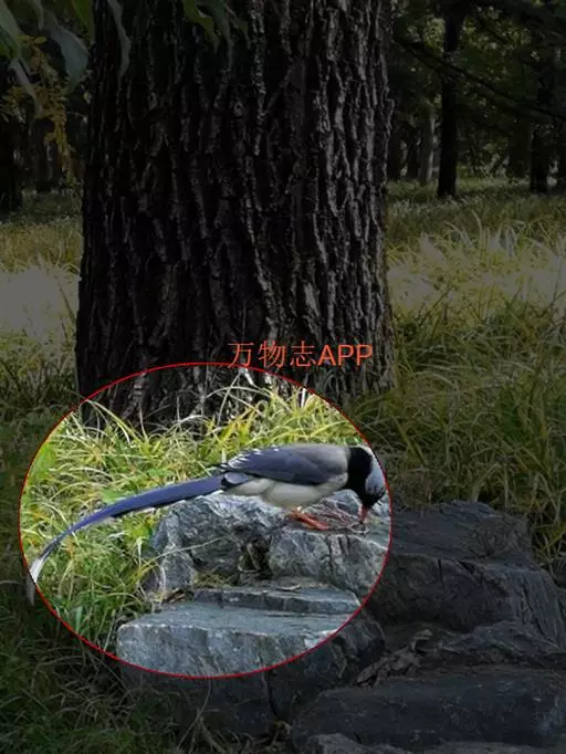 红嘴蓝鹊(学名:Urocissa erythrorhyncha) :是大型鸦类,体长54-65厘米。嘴、脚红色,头、颈、喉和胸黑色,头顶至后颈有一块白色至淡蓝白色或紫灰色块斑,其余上体紫蓝灰色或淡蓝灰褐色。尾长呈凸状具黑色亚端斑和白色端斑。下体白色。 黄嘴蓝鹊外形和羽色和该种非常相似,但黄嘴蓝鹊嘴为黄色,头部仅枕有白色块斑。区别仍很明显,野外不难识别。
