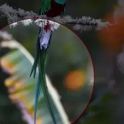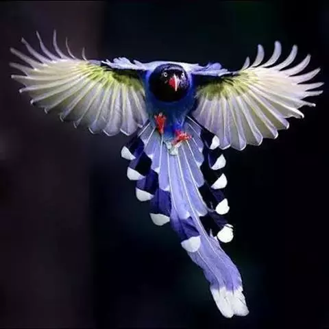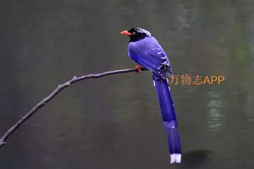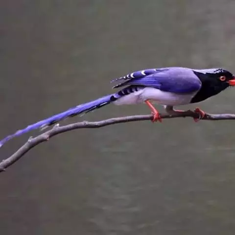 雌雄鸟体表羽色近似。体背蓝紫色;尾羽欣长,尤以中央两枚更加突出,尾端白色,配上红嘴、红脚,益显仪态庄重,雍容华贵,又有长尾蓝鹊之称。
