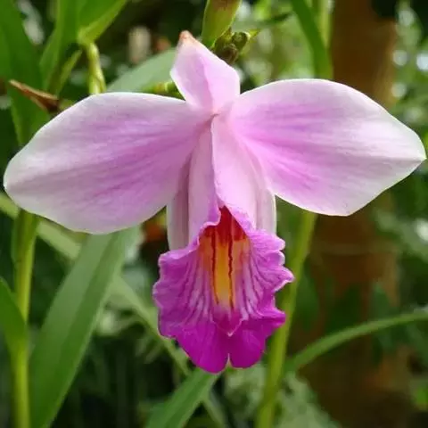 长叶山兰:假鳞茎椭圆形至近球形,有2-3节,外被撕裂成纤维状的鞘。叶2枚,偶有1枚,生于假鳞茎顶端…