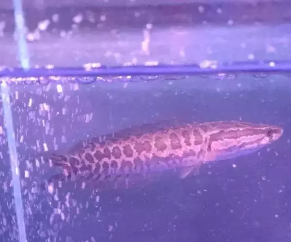 乌鳢体色呈灰黑色,体背和头顶色较暗黑,腹部淡白,体侧各有不规则黑色斑块,头侧各有2 行黑色斑纹。奇鳍黑白相间的斑点,偶鳍为灰黄色间有不规则斑点。