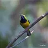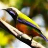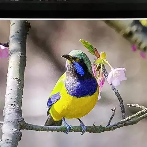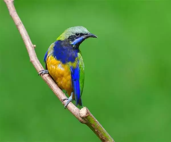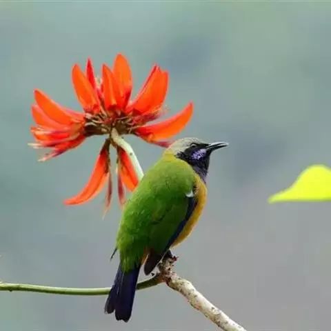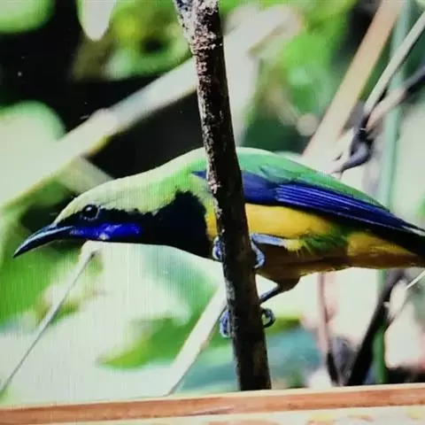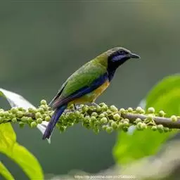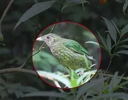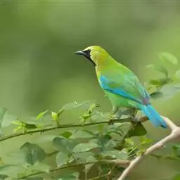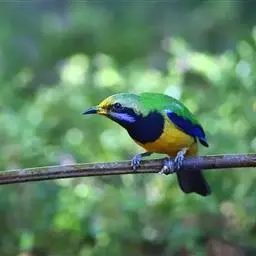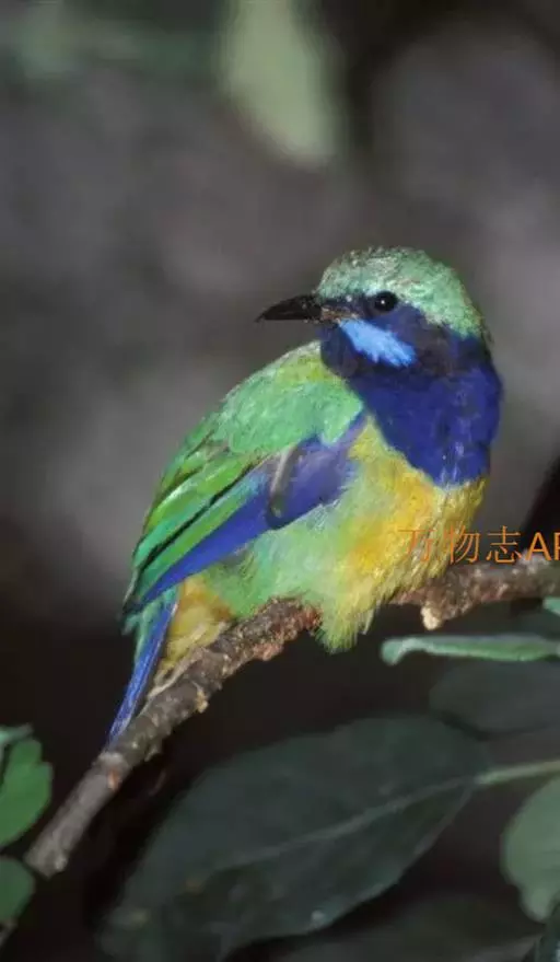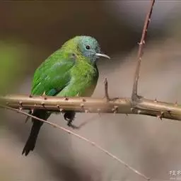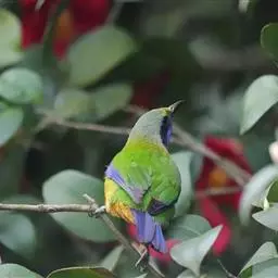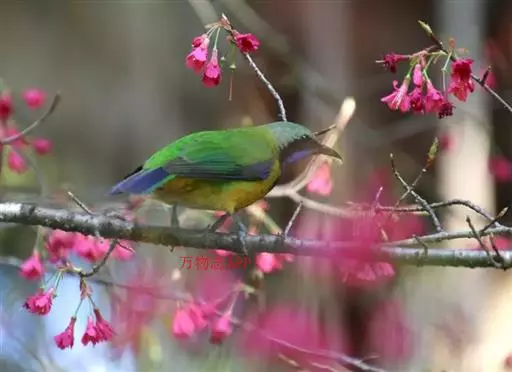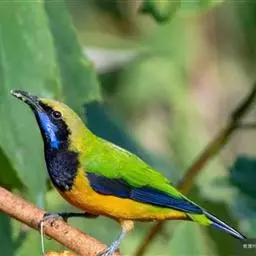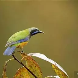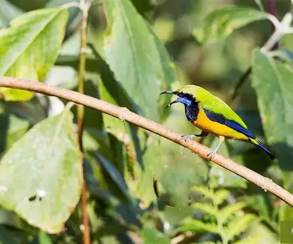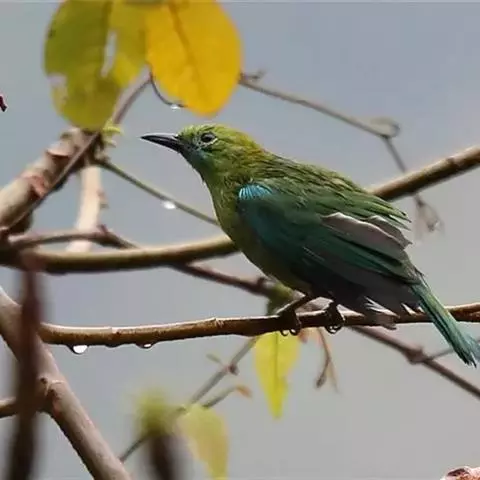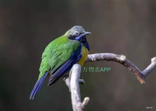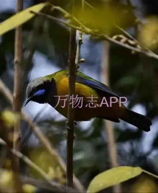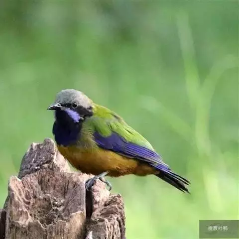蓝翅叶鹎:小型鸟类,体长15-18厘米。雄鸟通体草绿色,尾蓝绿色,肩和翅亮蓝 色,胸缀有黄色,…
