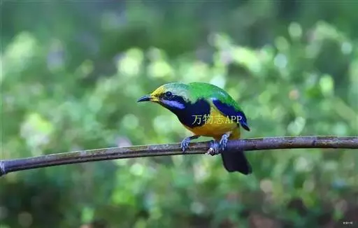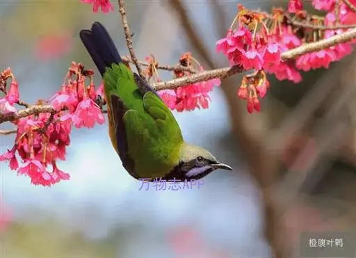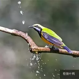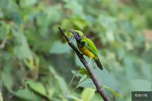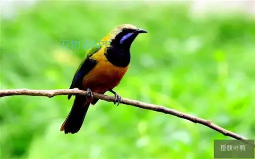 橙腹叶鹎体形大小和金额叶鹎相似,体长16~20厘米。额至后颈黄绿色,其余上体绿色,小覆羽亮钴蓝色,…
