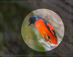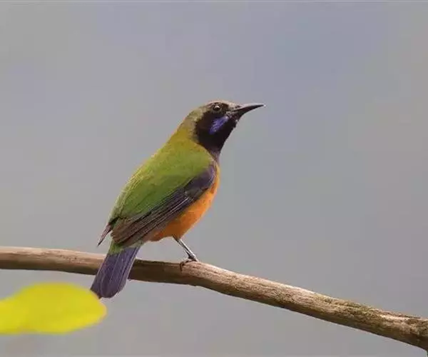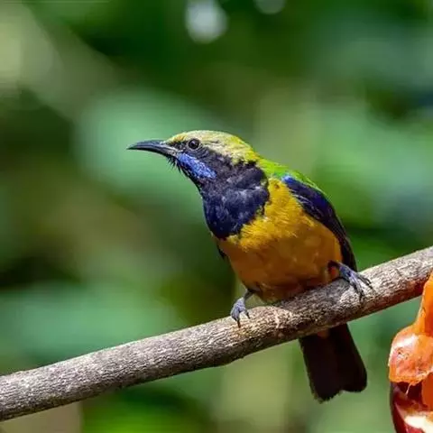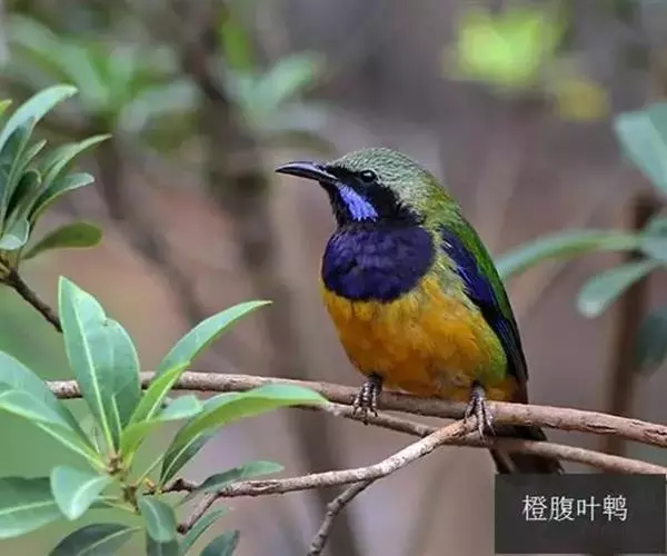 橙腹叶鹎(学名:Chloropsis hardwickii)体形大小和金额叶鹎相似,体长16~20厘米。额至后颈黄绿色,其余上体绿色,小覆羽亮钴蓝色,形成明显的肩斑。颏、喉、上胸黑色具钴蓝色髭纹,其余下体橙色。飞羽和尾羽雄鸟黑色、雌鸟绿色。