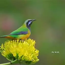 雌鸟和雄鸟大致相似,但上体全为草绿色,额和头顶不沾黄色,两翅表面、尾上覆羽和尾羽表面均为草绿色,髭纹淡钴蓝色。喉中部至上胸和腹部两侧均为浅绿色,橙色仅限于腹部中央和尾下覆羽。较雄鸟明显为小,其他似雄鸟。