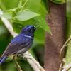 小仙鹟前部额基、眼先、耳羽、眼周黑色,前额、头顶两侧眉区、腰、尾上覆羽和颈侧块斑辉钴蓝色,头顶至后颈、背、肩、两翅和尾表面概为紫蓝色或深蓝色,翅上大覆羽和飞羽褐色或黑褐色、具窄的暗蓝色或紫蓝色羽缘。颏、喉和上胸黑色或深紫蓝色,下胸暗灰色,腹、两胁淡灰色,腹和尾下覆羽淡灰色或白色,腋羽和翼下覆羽白色。
