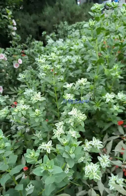 银边翠 一年生草本。根纤细,极多分枝,长可达20厘米以上,直径3-5毫米。茎单一,自基部向上极多分枝,高可达60-80厘米,直径3-5毫米,光滑,常无毛,有时被柔毛。叶互生,椭圆形,长5-7厘米,宽约3厘米,先端钝,具小尖头,基部平截状圆形,绿色,全缘;无柄或近无柄;总苞叶2-3枚,椭圆形,长3-4厘米,宽1-2厘米,先端圆,基部渐狭。全缘,绿色具白色边;伞幅2-3,长1-4厘米,被柔毛或近无毛;苞叶椭圆形,长1-2厘米,宽5-7(9)毫米,先端圆,基部渐狭,近无柄花序单生于苞叶内或数个聚伞状着生,基部具柄,柄长3-5毫米,密被柔毛;总苞钟状,高5-6毫米,直径约4毫米,外部被柔毛,边缘5裂,裂片三角形至圆形,尖至微凹,边缘与内侧均被柔毛;腺体4,半圆形,边缘具宽大的白色附属物,长与宽均超过腺体。雄花多数,伸出总苞外;苞片丝状;雌花1枚,子房柄较长,长达3-5毫米,伸出总苞之外,被柔毛;子房密被柔毛;花柱3,分离;柱头2浅裂。蒴果近球状,长与直径均约5.5毫米,具长柄,长达3-7毫米,被柔毛;花柱宿存;果成熟时分裂为3个分果爿。种子圆柱状,淡黄色至灰褐色,长3.5-4毫米,直径2.8-3毫米。被瘤或短刺或不明显的突起;无种阜。花果期6-9月。