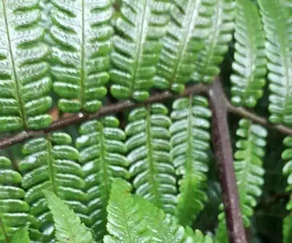 植株高达2米多。根状茎短而斜升,密生黑棕色鳞片。叶柄黑色,基部生宿存的鳞片;鳞片线形,长达2厘米,宽1.5毫米,淡棕色,光亮,有不明显的狭边;叶片三回羽裂;羽片长达40厘米;小羽片长6-9厘米,宽1.6-2.2厘米,向顶端渐狭,深羽裂,距小羽轴2-4毫米,基部一对裂片不分离;裂羽狭长,先端有小圆齿;叶脉分离,每裂片有小脉5-6对,单一,基部下侧一小脉出自主脉;羽轴红棕色,近光滑,残留疏鳞片;鳞片小,灰色,少数较狭的鳞片先端有黑色的长刚毛;小羽轴的基部生鳞片;鳞片黑棕色,有灰色的边,先端呈弯曲的刚毛状,较小的鳞片灰色,基部稍为泡状,先端长刚毛状。孢子囊群生于小脉中部;囊群盖缺;隔丝多,其长度比孢子囊稍长或近相等。