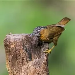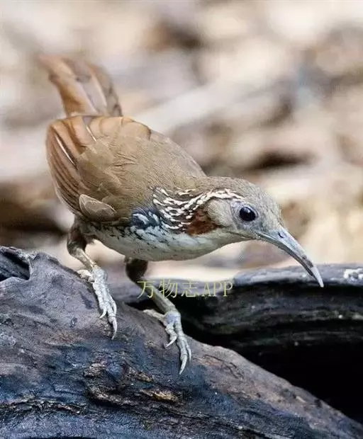 剑嘴鹛:中型鸟类,体长21-22厘米。嘴特别细长而向下弯曲,头顶和头侧烟灰色具长而窄的白色眉纹,…