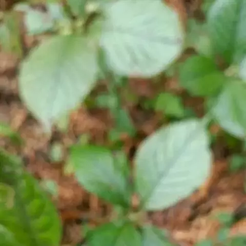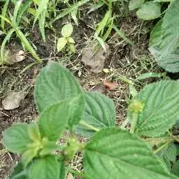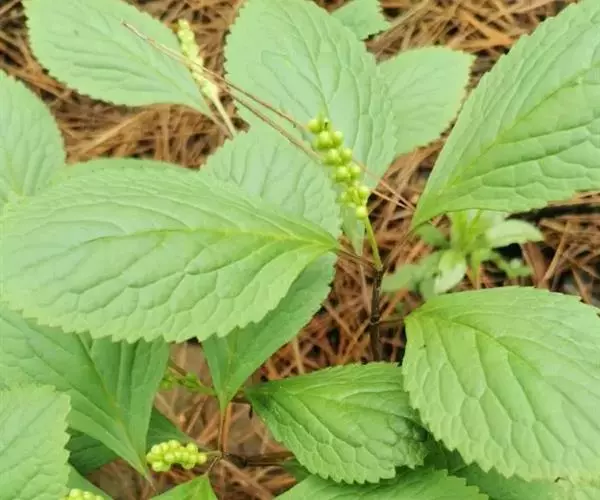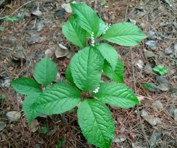 及己属多年生草本,高约30厘米。茎圆形,无毛。叶对生,4—6片,生于茎上部,卵形或卵状披针形,长4—8厘米,宽2.5—6厘米,顶端渐尖,基部楔形或阔楔形,边缘有圆锯齿,齿尖有1腺体。穗状花序单生或2—3分枝,长4—5厘米;苞片近半圆形,顶端有波状小齿;雄蕊3,下部合生,白色,中间一个雄蕊较长,花药2室,侧生的2个较短,花药l室;子房卵形。核果梨形,长约2毫米。花果期4—6月。