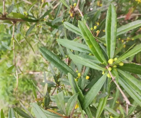 常绿灌木,高1-3米。老枝黄褐色或灰褐色,幼枝淡黄色,具条棱和稀疏黑色疣点;茎刺粗壮,三分叉,腹面具槽,与枝同色,长1-4厘米。叶革质,椭圆形,披针形或倒披针形,长3-10厘米,宽1-3厘米,先端渐尖,基部楔形,上面深绿色,中脉凹陷,侧脉微显,背面淡绿色,中脉隆起,侧脉微隆起或不显,两面网脉不显,不被白粉,叶缘平展,每边具10-20刺齿;叶柄长1-4毫米。花10-25朵簇生;花梗长8-15毫米;花黄色;小苞片卵形,长约2.5毫米,宽约1.5毫米,先端急尖;萼片2轮,外萼片卵形,长约5毫米,宽约3毫米,先端急尖,内萼片长圆状椭圆形,长约7毫米,宽约4毫米,先端圆钝;花瓣长圆状椭圆形,长约6毫米,宽约3毫米,先端缺裂,基部缢缩呈爪,具2枚长圆形腺体;胚珠单生。浆果长圆形,蓝黑色,长7-8毫米,直径3.5-4毫米,顶端具明显宿存花柱,被白粉。花期3月,果期5-11月。