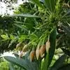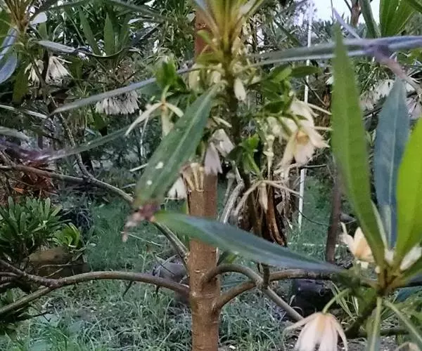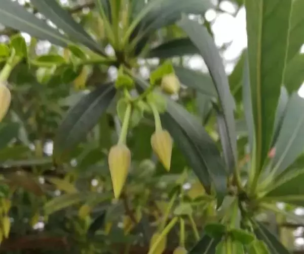 核果纺锤形,两端尖,长约4cm,中央宽1-1.2cm;内果皮坚骨质,表面有浅沟,腹缝线2条,厚1.5mm,1室;种子长2cm。花期6-7月。