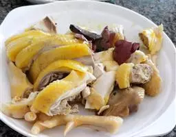 白切鸡又叫白斩鸡,是粤菜系鸡肴中的一种,始于清代的民间酒店。属浸鸡类。其特点为制作简易,刚熟不烂,不加配料且保持原味。白切鸡通常选用三黄鸡与沙姜、蒜茸、葱等食材,慢火煮浸后,晾干切块。成菜后,色洁白带油黄,皮爽肉滑骨香,清淡鲜美。 白切鸡皮爽肉滑,清淡鲜美,驰名粤港澳,现在南方菜系中普遍存在。